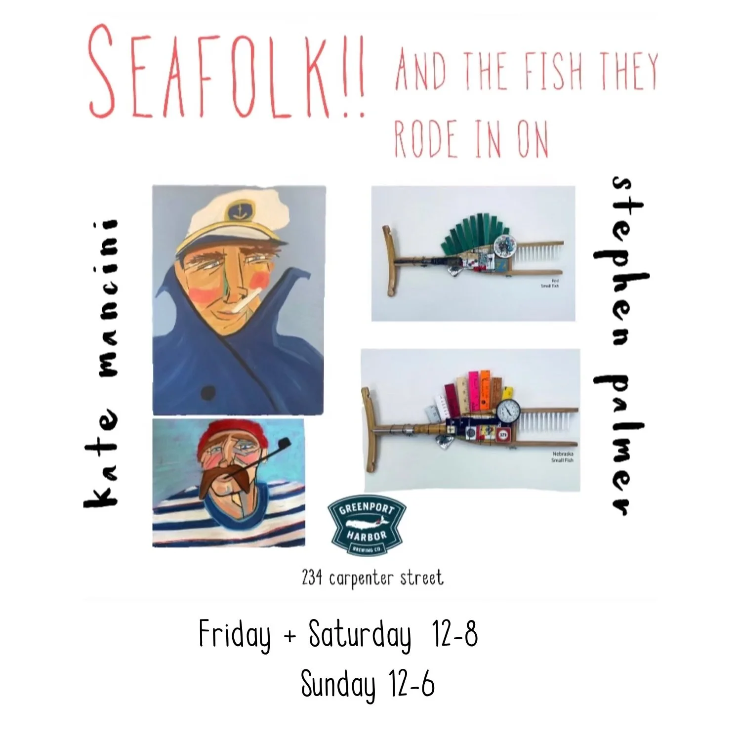 Join us at our 234 Carpenter Street, Greenport location where in addition to newly released beers on tap, we are currently showing new work by artists Kate Mancini and Stephan Palmer. The exhibit, Sea-Folk and the Fish They Rode In On, features Mancini's primitively modern portraits of sea captains with Palmer's whimsical mixed media fish sculptures. This exhibit will run through April, 2024.
