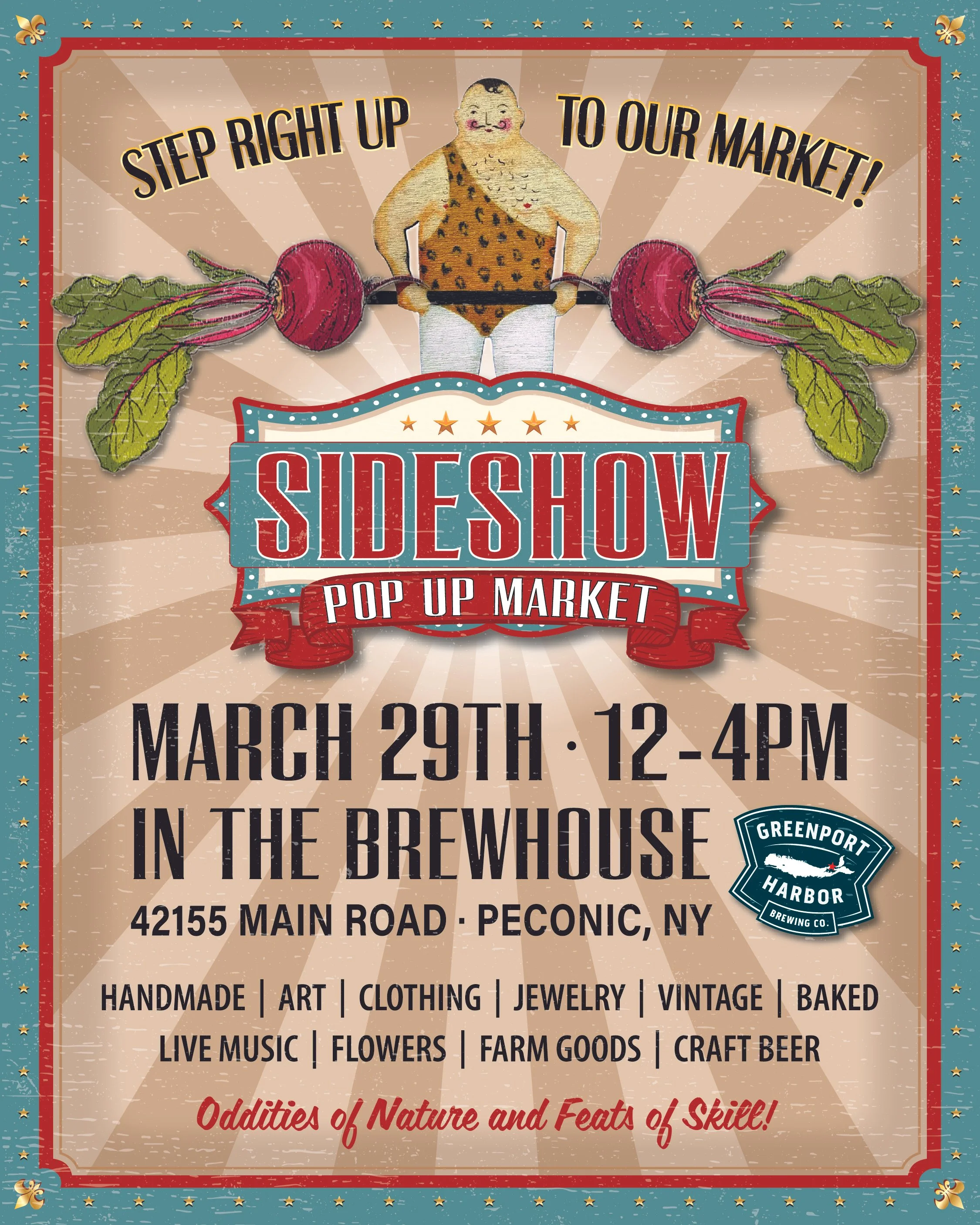 Our SIDESHOW Pop Up is a fun, upbeat market where you can shop for handmade goods, vintage, art, farm items, and unique treasures. It's set up in the brewhouse, giving it a great vibe with live music by Spencer L'Roy. Plus, there's always tasty food, craft beer, local wine and specialty drinks.